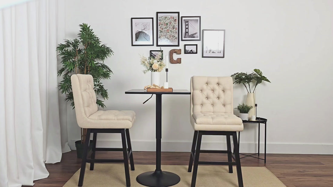 Indulge in sophisticated seating with these exquisitely crafted counter‐height bar stools. Each stool is a testament to superior design, featuring a precision‐tufted backrest that showcases meticulous attention to detail. The premium polyester upholstery, with its luxurious linen‐like texture, envelops you in comfort while exuding an air of understated elegance.