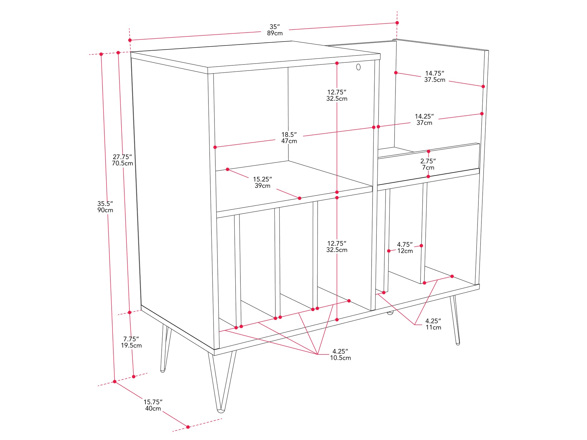 Built for both style and utility, the stand features cut outs in the back panel for effortless cable management, ensuring a clutter‐free setup. The hair pin legs provide exceptional stability, while the spacious compartments offer ample room to organize your music collection, books, or decorative accents. Whether you’re an avid vinyl enthusiast or simply love a retro‐inspired aesthetic, this record stand is a must‐have addition to your home.