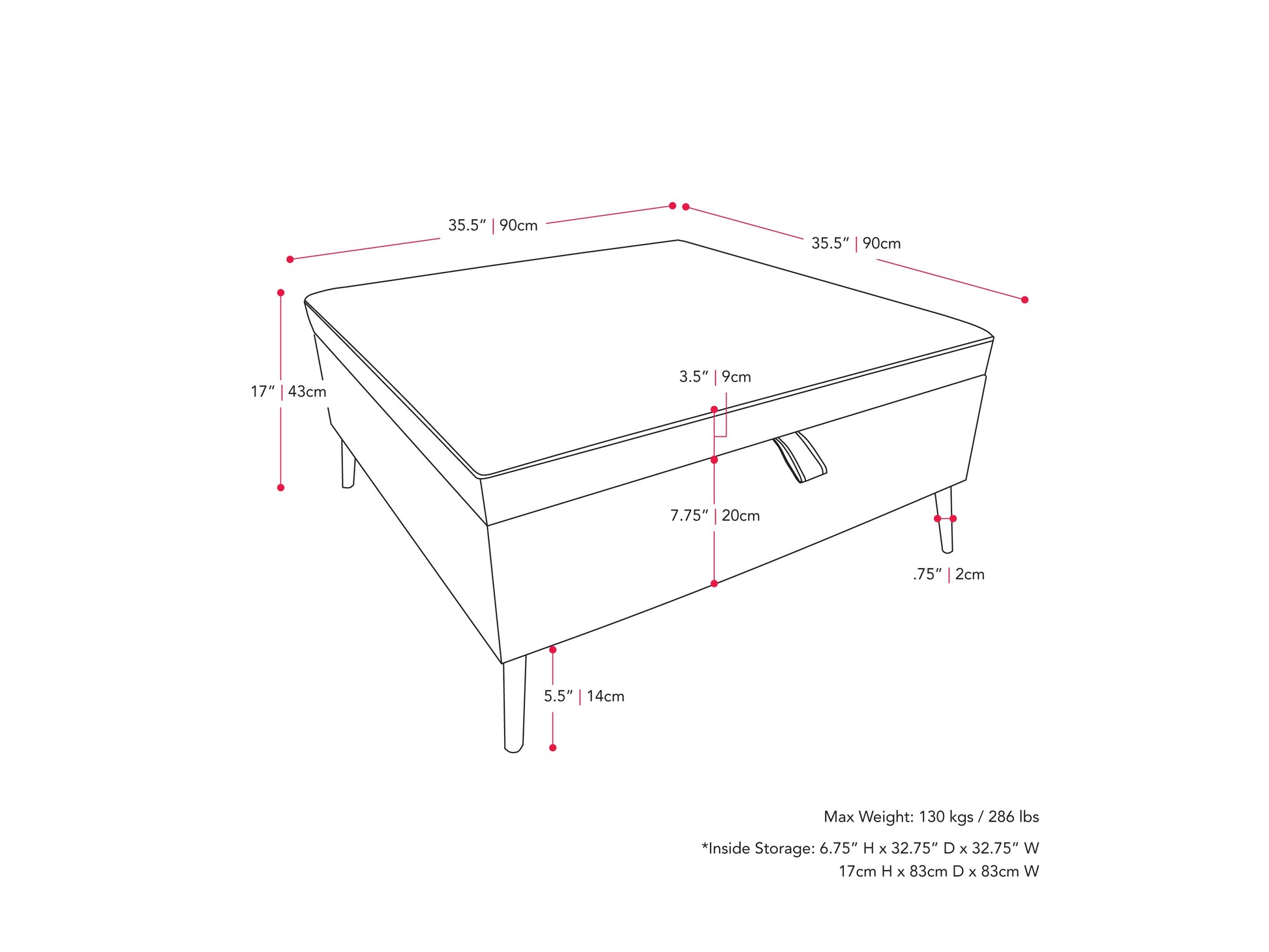 The clean lines and contemporary finish create a versatile piece that enhances any living space. At an ideal 17-inch height and with a generously sized surface, this ottoman seamlessly transitions between the coffee table and footrest while providing hidden storage exactly where you need it.