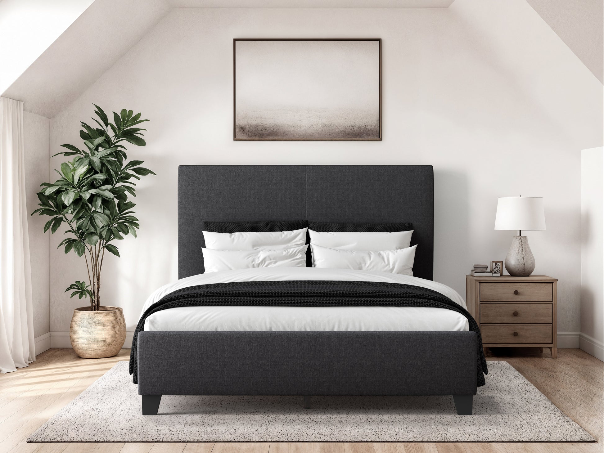 Transform your bedroom into a sanctuary of sophisticated comfort with our meticulously crafted platform bed. The headboard is wrapped in premium polyester upholstery, creating a striking architectural statement that draws the eye while providing the perfect support for your evening reading routine. Each careful detail, from the tailored seaming to the genuine rubberwood legs, speaks to the thoughtful fusion of form and function.