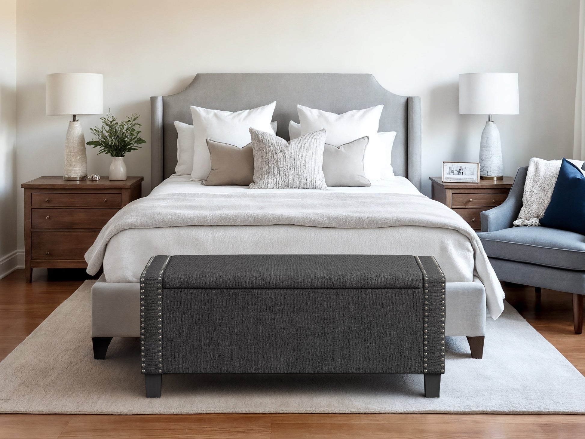 Experience this meticulously crafted bench's perfect fusion of refined design and purposeful storage. The classic silhouette, adorned with handcrafted nailhead trim and wrapped in sumptuous upholstery, speaks to a legacy of fine furniture making. Each detail has been carefully considered to create a piece that elevates your space while providing the intelligent storage solutions that modern living demands.